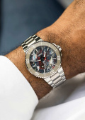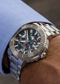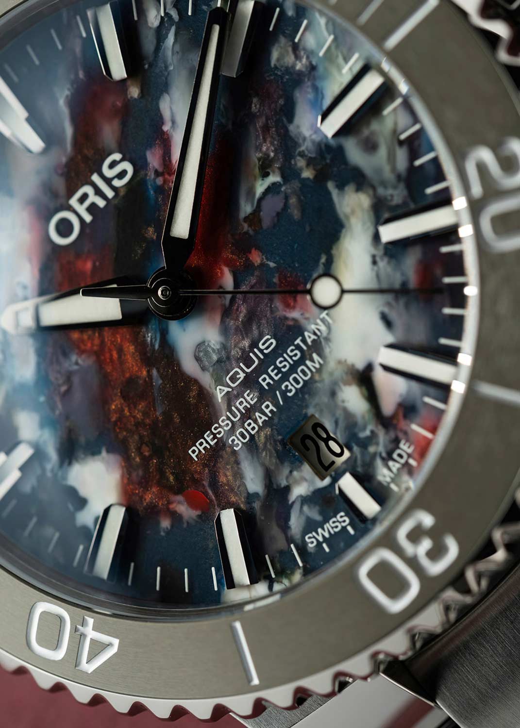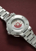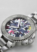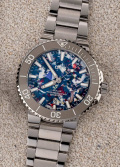 Круглый многокомпонентный корпус из нержавеющей стали. Рифленый керамический безель с минутной шкалой. Циферблат изготовлен из переработанного пластика, иллюстрируя идею очищения океанов и сохранения планеты. Не существует двух одинаковых циферблатов.