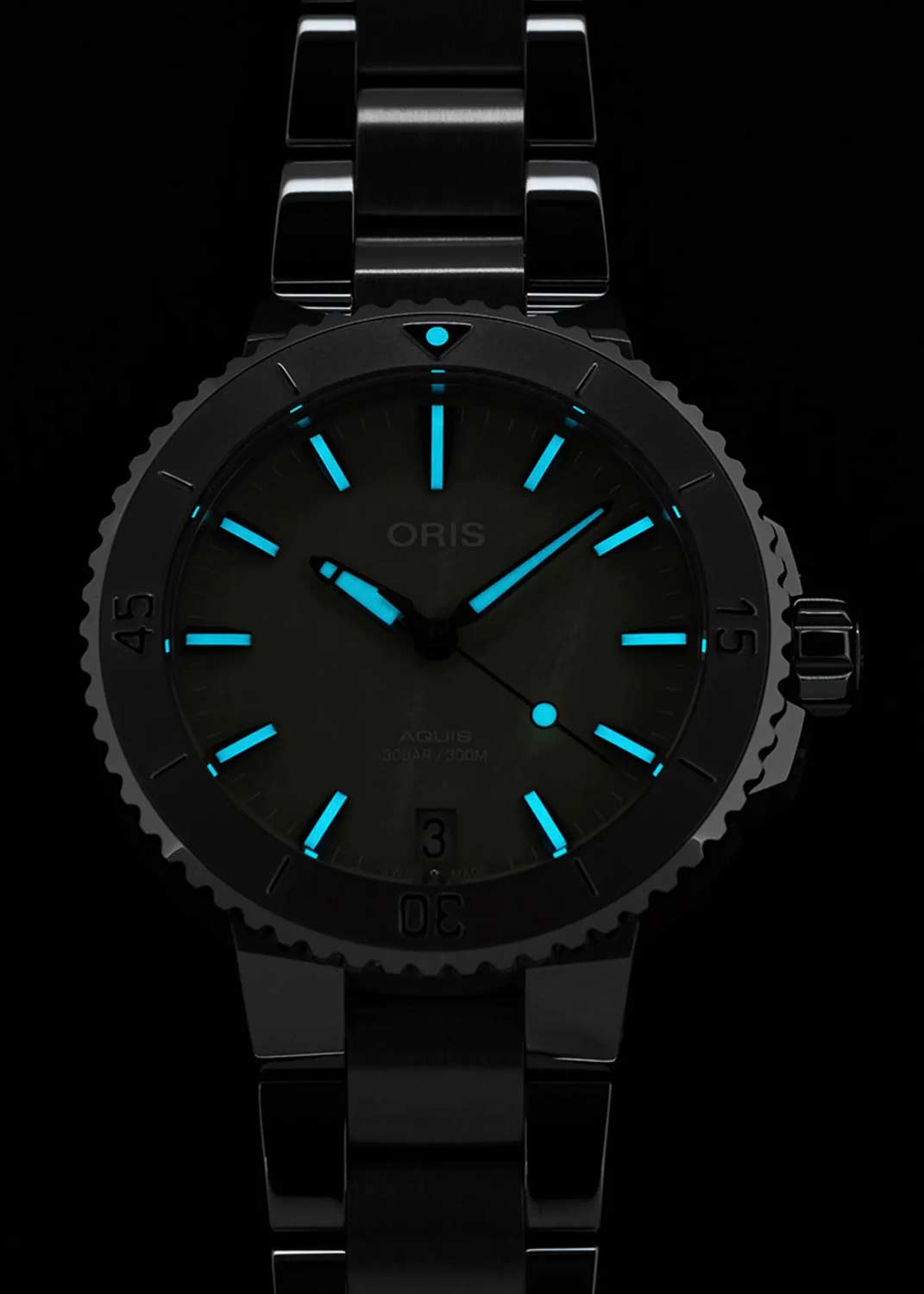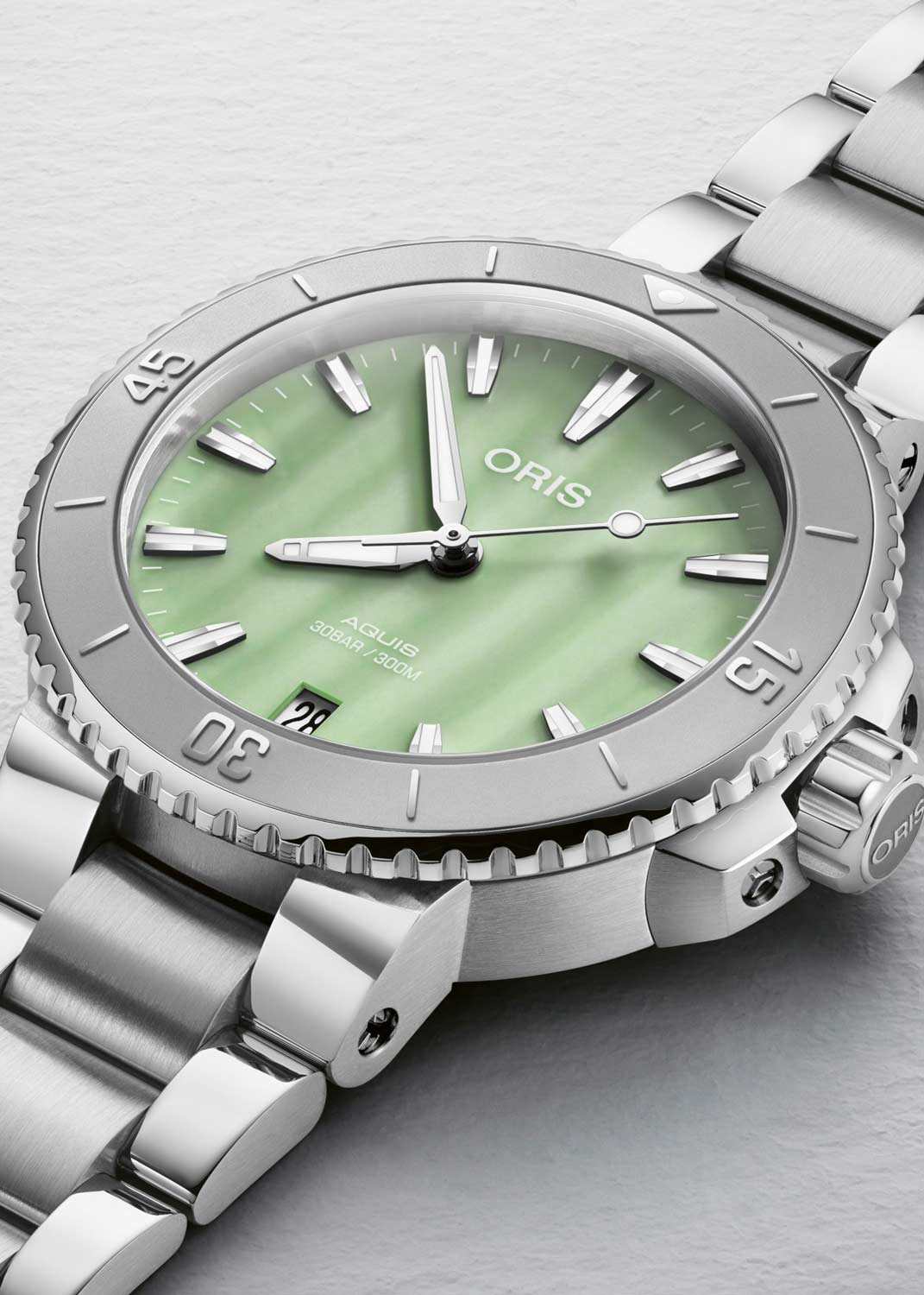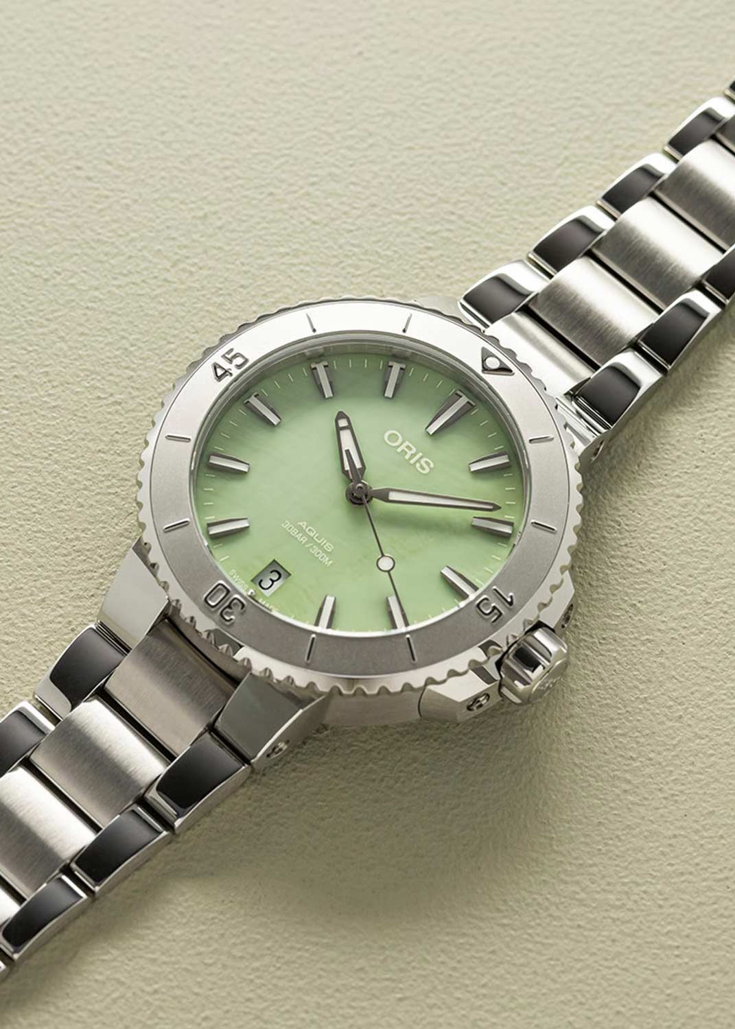 Круглый многокомпонентный корпус из нержавеющей стали. Рифленый безель с минутной шкалой. Перламутровый циферблат цвета морской волны. Метки в виде штрихов. Окошко даты находится в положении 6 часов.