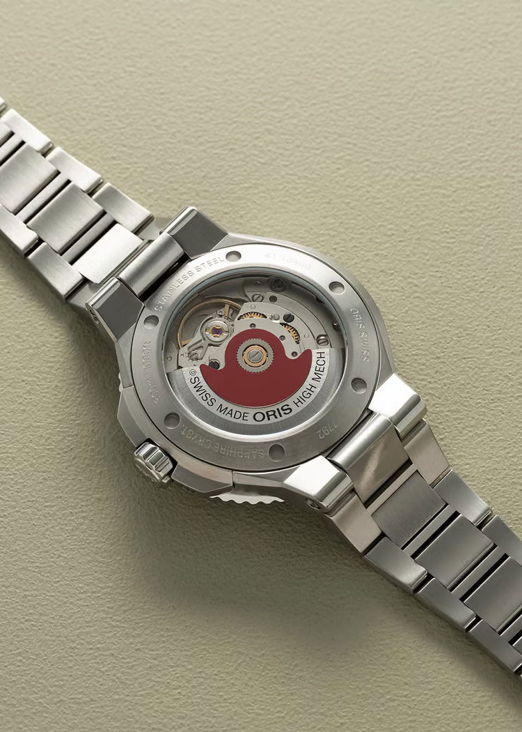 Завинчивающаяся прозрачная задняя крышка с минеральным стеклом. Рифленая заводная головка с защитой. Браслет с раскладывающейся застежкой.