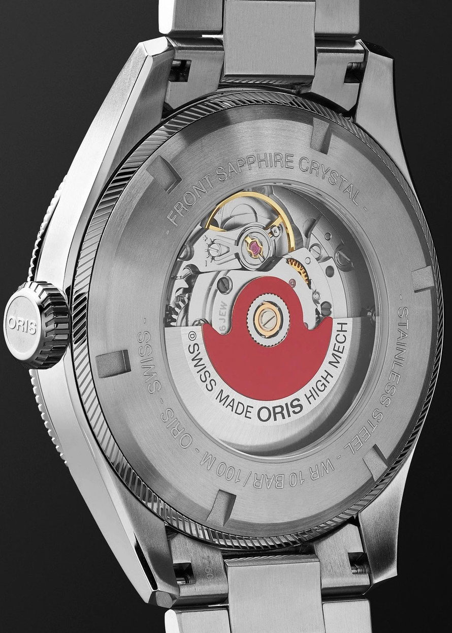 Завинчивающаяся прозрачная задняя крышка с минеральным стеклом. Рифленая заводная головка. Браслет с раскладывающейся застежкой.