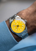 Циферблат с метками в виде арабских цифр. Дата отображается центральной стрелкой – исторически сложившийся дизайн. Завинчивающаяся прозрачная задняя крышка. Браслет с раскладывающейся застежкой.