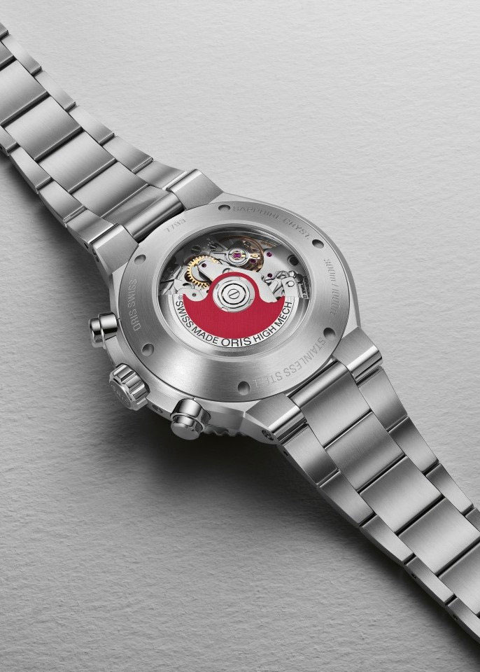 Завинчивающаяся заводная головка с защитой. Завинчивающаяся прозрачная задняя крышка с минеральным стеклом. Стальной браслет с раскладывающейся застежкой.