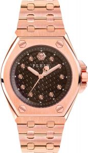 Женские наручные часы Plein Extreme Lady. Стальной корпус украшен знаковыми винтами. Циферблат с шестиугольной текстурой с метками в виде точек украшенными коричневыми кристаллами Swarovski и логотипом ''PP'' в положении 12 часов. Заводная головка с защитой. Стальной браслет с раскладывающейся застежкой. Фирменная дизайнерская упаковка.
