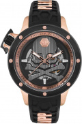 Plein Rich. Скелетонизированные наручные часы. Стальной корпус с круглым безелем. Метки в виде штрихов, инкрустированные кристаллами. Нестандартная заводная головка. Прозрачная задняя крышка. Удобный силиконовый ремешок с рельефным прописным логотипом и классической застежкой.