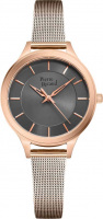 Женские часы с круглым корпусом. Циферблат с метками в виде штрихов выполнен по технологии Sunray (солнечные лучи). Рифленая заводная головка. Браслет миланского плетения.