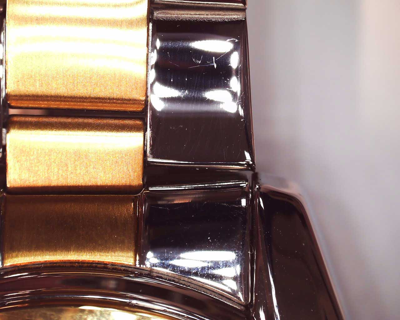 Мужские кварцевые часы. Круглый металлический корпус c полированной поверхностью. Циферблат с метками в виде штрихов выполнен по технологии Sunray (солнечные лучи) и защищен минеральным стеклом. Окошко даты и дня недели находится в положении 3 часа. Стрелки с люминесцентным покрытием, которое светится в темноте после непродолжительной зарядки на свету. Рифленая заводная головка с защитой. Надежный стальной браслет с частичным PVD покрытием цвета желтого золота и раскладывающейся застежкой.
