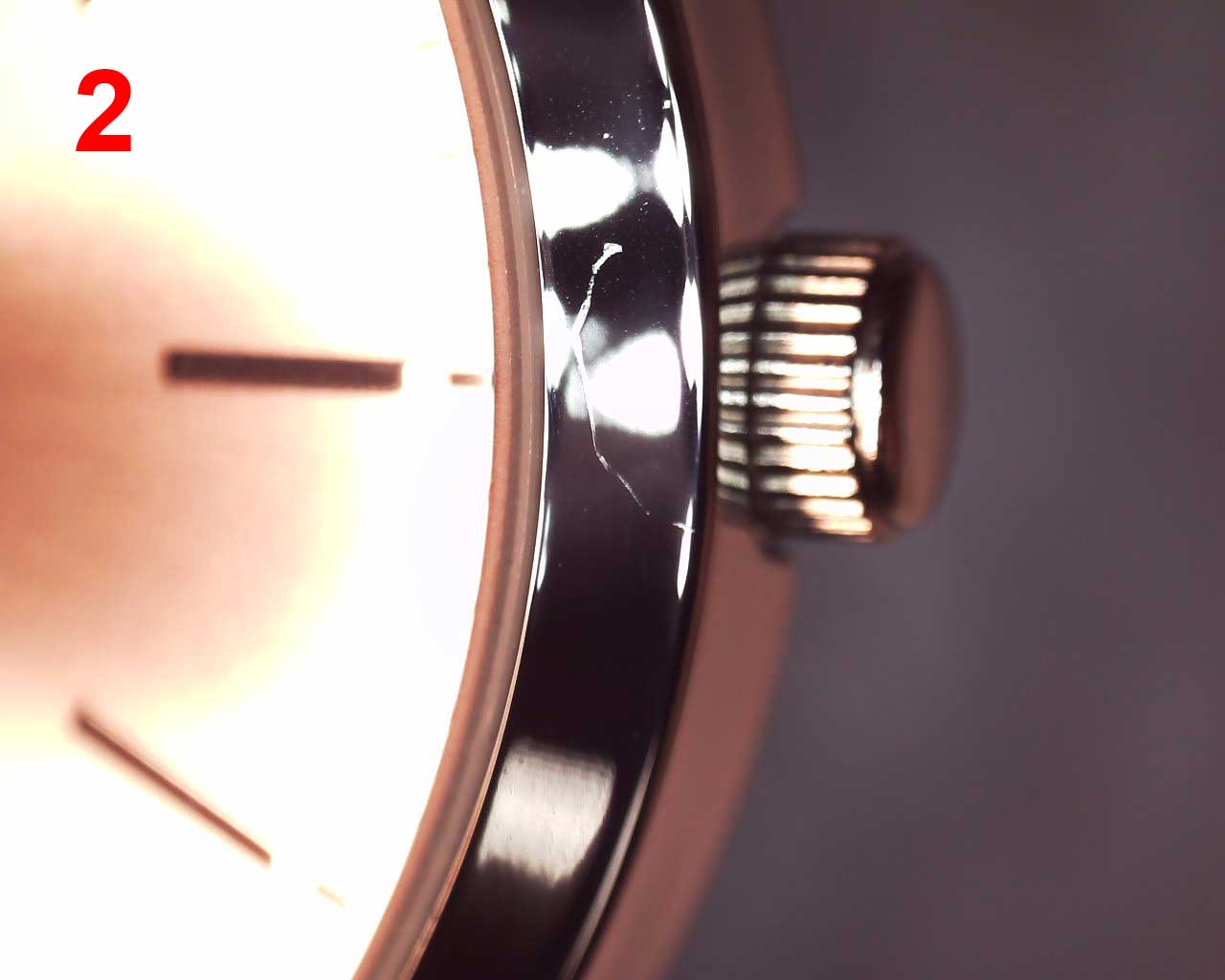 1. Дефект покрытия циферблата, мелкие царапины на безеле.