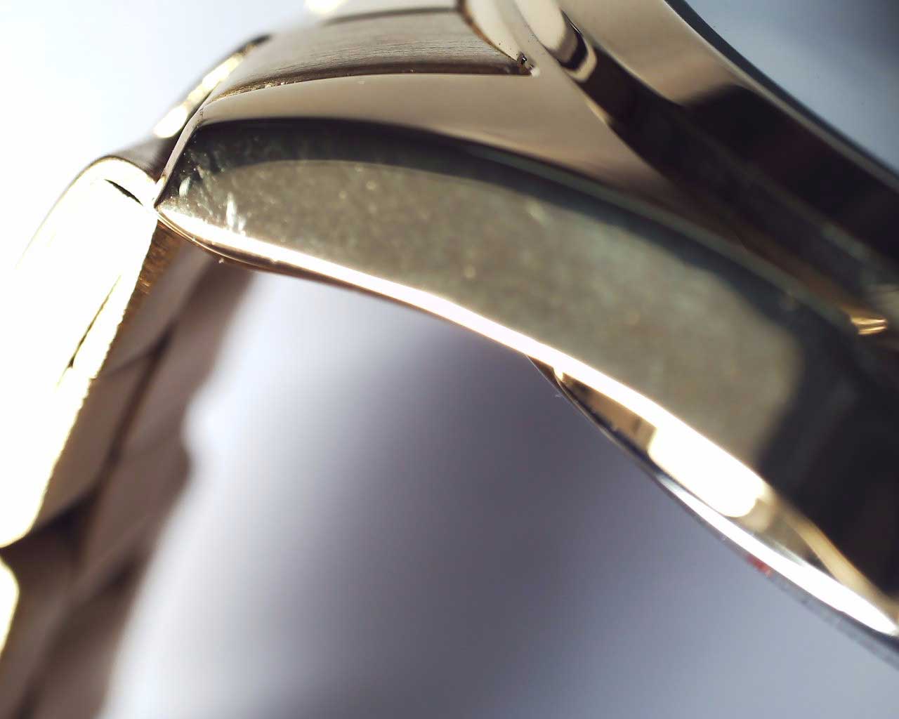 Мужские кварцевые часы. Круглый металлический корпус c полированной поверхностью. Циферблат с метками в виде штрихов выполнен по технологии Sunray (солнечные лучи) и защищен минеральным стеклом. Рифленая заводная головка с защитой. Надежный стальной браслет с PVD покрытием цвета желтого золота и раскладывающейся застежкой.