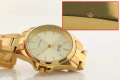 Женские кварцевые часы. Круглый металлический корпус c полированной поверхностью. Циферблат с метками в виде штрихов выполнен по технологии Sunray (солнечные лучи) и защищен минеральным стеклом. Рифленая заводная головка с защитой. Надежный стальной браслет с PVD покрытием цвета желтого золота и раскладывающейся застежкой.