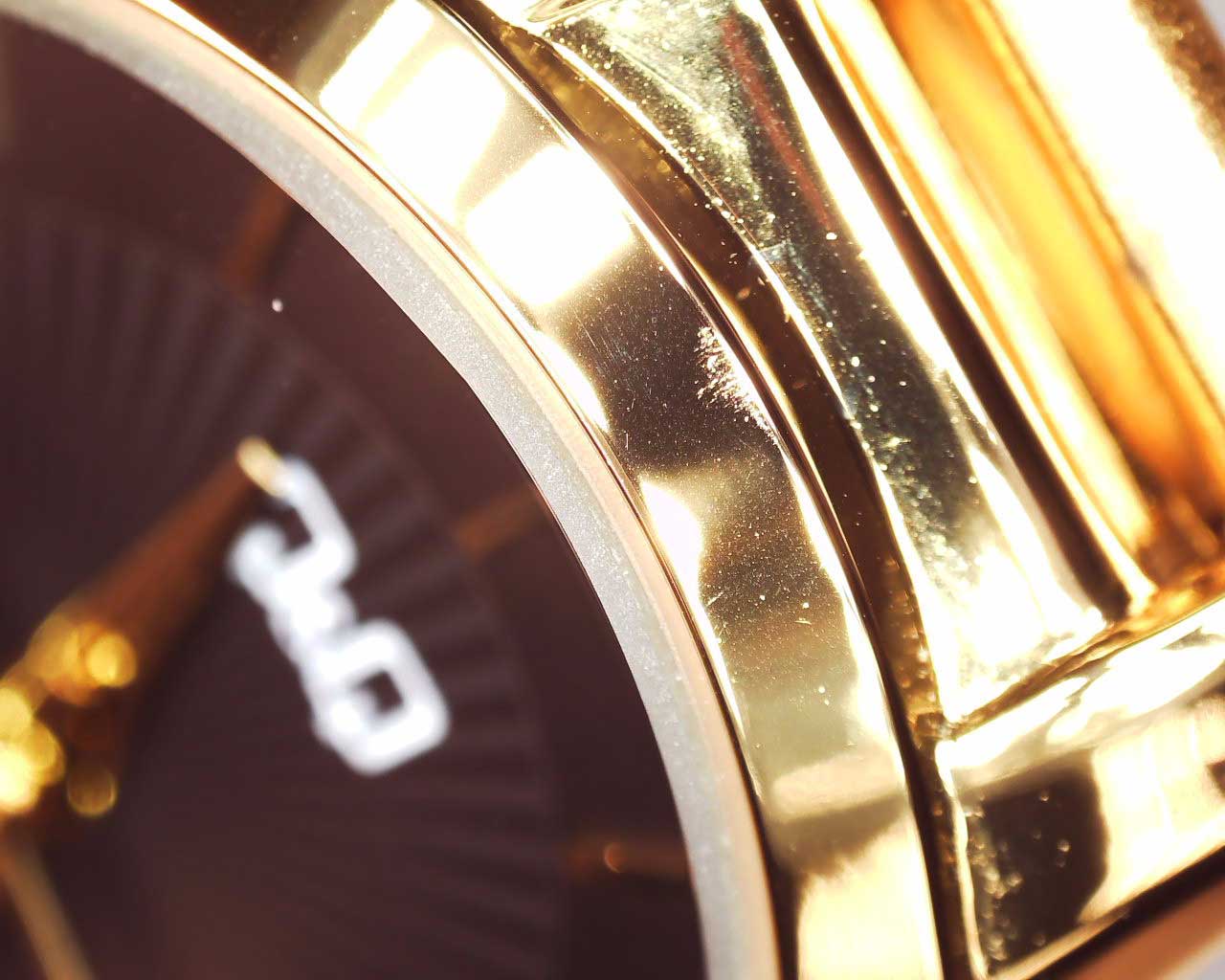 Женские кварцевые часы. Круглый металлический корпус c полированной поверхностью. Циферблат выполнен по технологии Sunray (солнечные лучи), декорирован узором в виде расходящихся лучей в центре и защищен минеральным стеклом. Метки в виде штрихов. Широкие клиновидные стрелки в стиле Dauphine. Рифленая заводная головка. Надежный стальной браслет с частичным PVD покрытием цвета желтого золота и раскладывающейся застежкой.