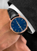 Узкие прямоугольные стрелки в стиле Baton. Окошко даты находится в положении 6 часов. Рифленая заводная головка. Прозрачная задняя крышка. Удобный кожаный ремешок с раскладывающейся застежкой.