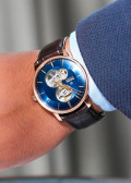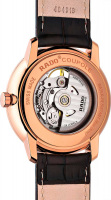 Сквозь прозрачное окошко на циферблате можно наблюдать за работой механизма часов. Накладные метки в виде штрихов. Листовидные стрелки в стиле Feuille. Прозрачная задняя крышка. Рифленая заводная головка. Удобный кожаный ремешок с раскладывающейся застежкой.