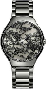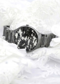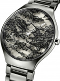 Круглый корпус. Циферблат без меток выполнен по технологии Sunray (солнечные лучи). Черный кружевной узор нанесен цифровым способом на изогнутую внутреннюю поверхность сапфирового стекла.