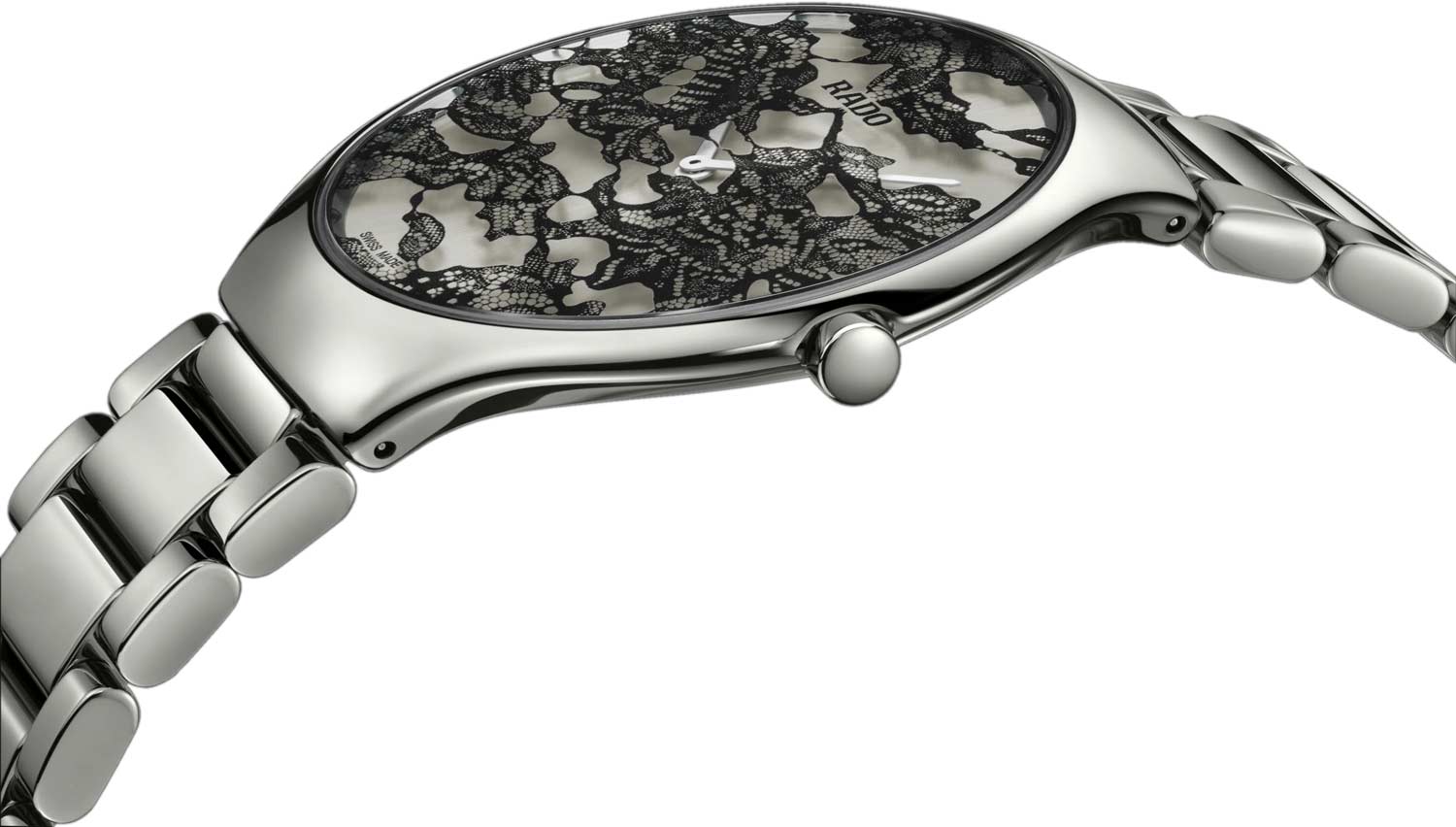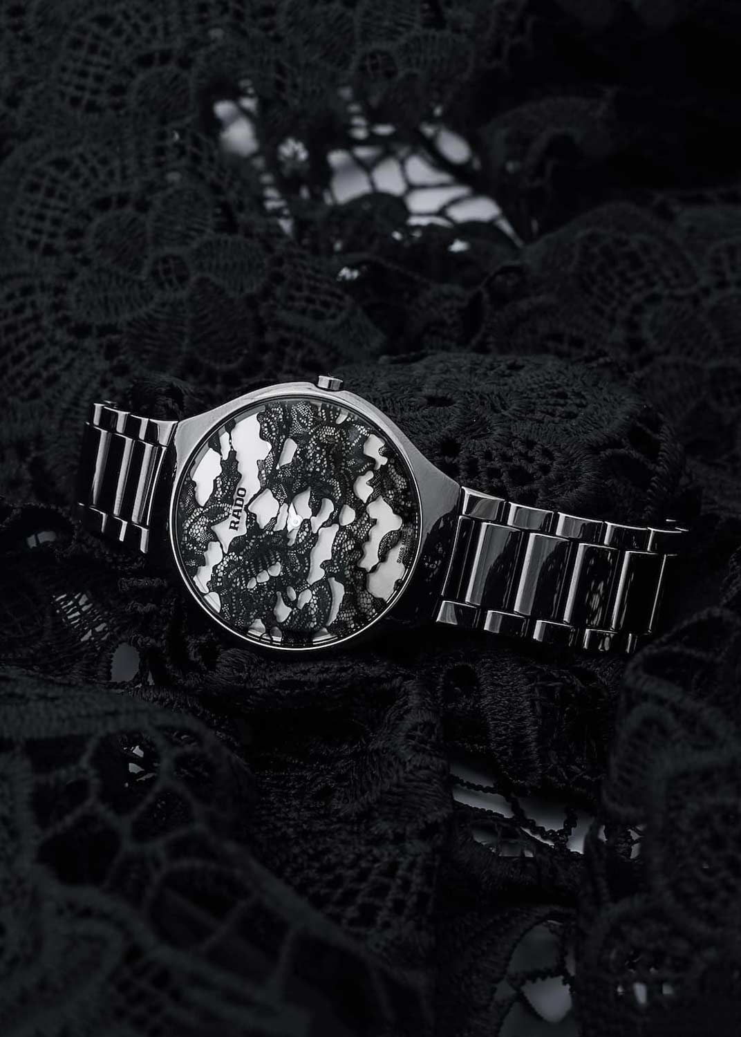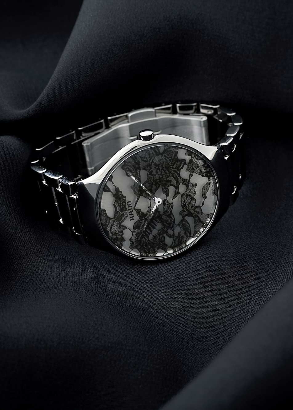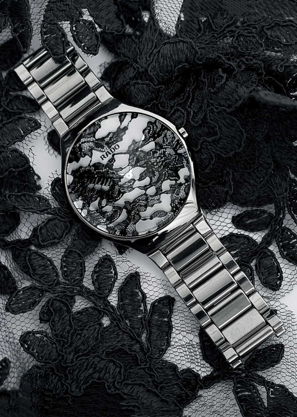 Круглый корпус. Циферблат без меток выполнен по технологии Sunray (солнечные лучи). Черный кружевной узор нанесен цифровым способом на изогнутую внутреннюю поверхность сапфирового стекла.