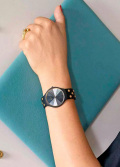 Ультратонкая модель. Круглый керамический корпус. Сатинированный циферблат без меток. Узкие прямоугольные стрелки в стиле Baton. Секундная стрелка отсутствует.