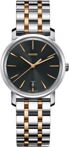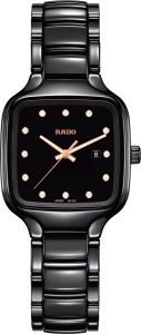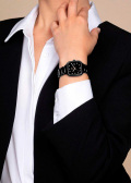 Прямоугольные стрелки в стиле Baton с люминесцентным покрытием, которое светится в темноте после непродолжительной зарядки на свету. Окошко даты находится в положении 3 часа. Рифленая заводная головка. Надежный керамический браслет с раскладывающейся застежкой.