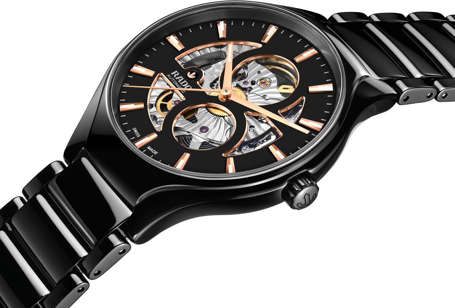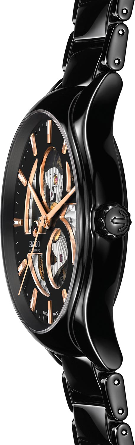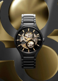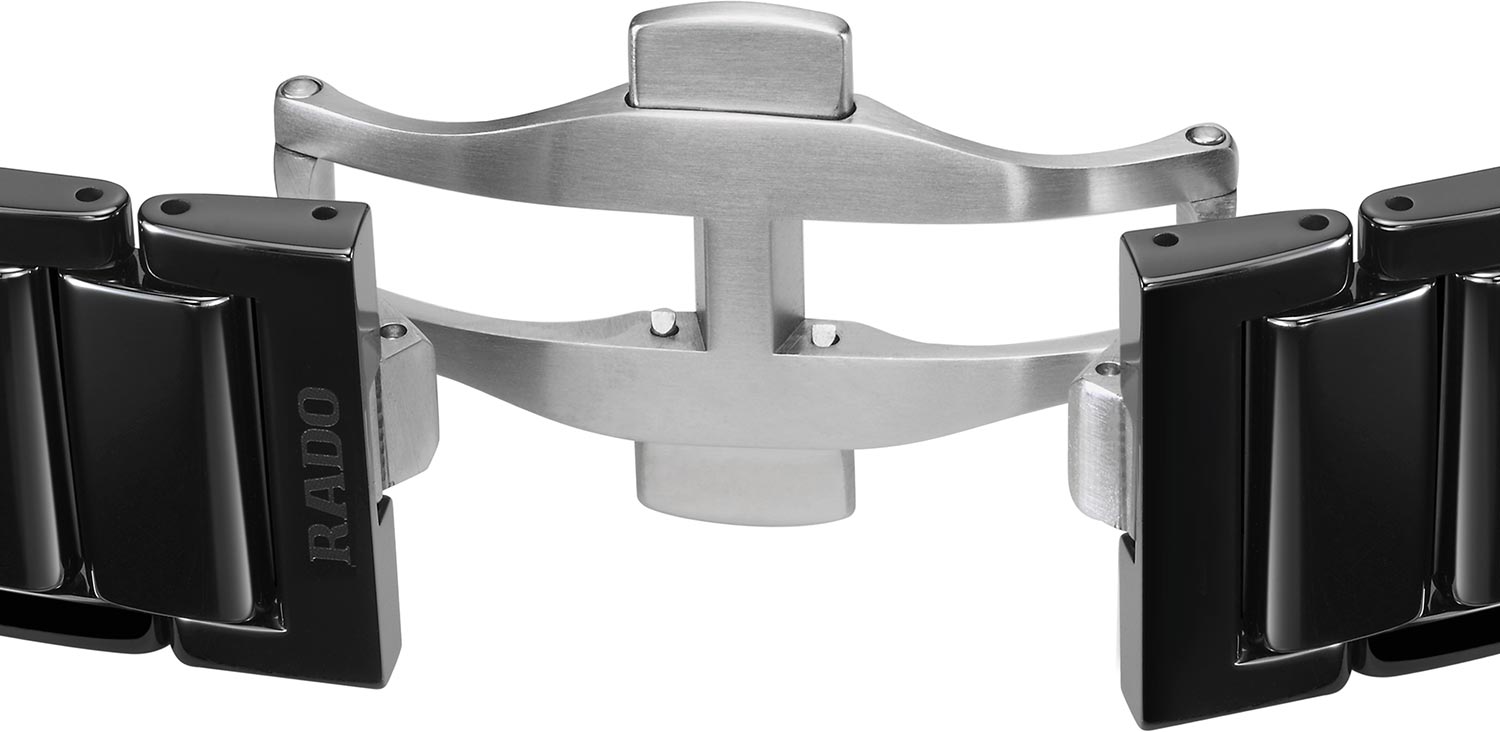 Сквозь прозрачное окошко на циферблате можно наблюдать за работой механизма часов. Накладные метки в виде штрихов. Прямоугольные стрелки в стиле Baton. Метки и стрелки с люминесцентным покрытием, которое светится в темноте после непродолжительной зарядки на свету. Рифленая заводная головка. Прозрачная задняя крышка. Надежный керамический браслет с раскладывающейся титановой застежкой.