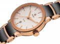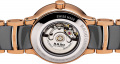 Рифленая заводная головка. Прозрачная задняя крышка. Надежный стальной браслет со вставками из серой керамики. Раскладывающаяся застежка.