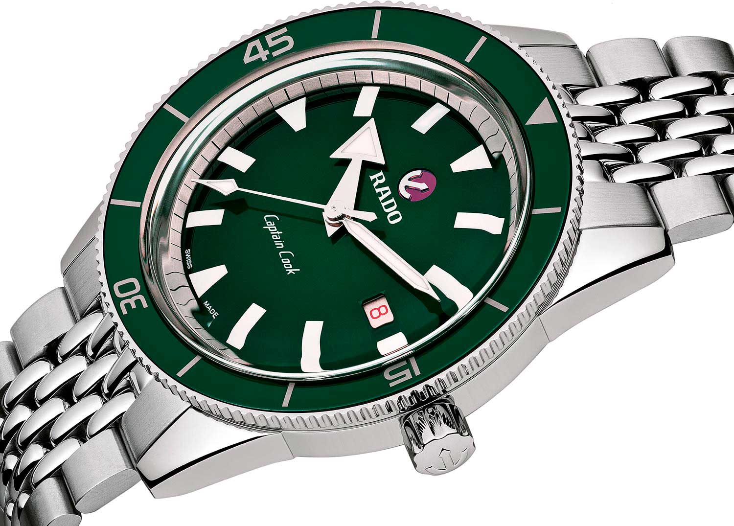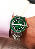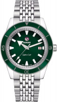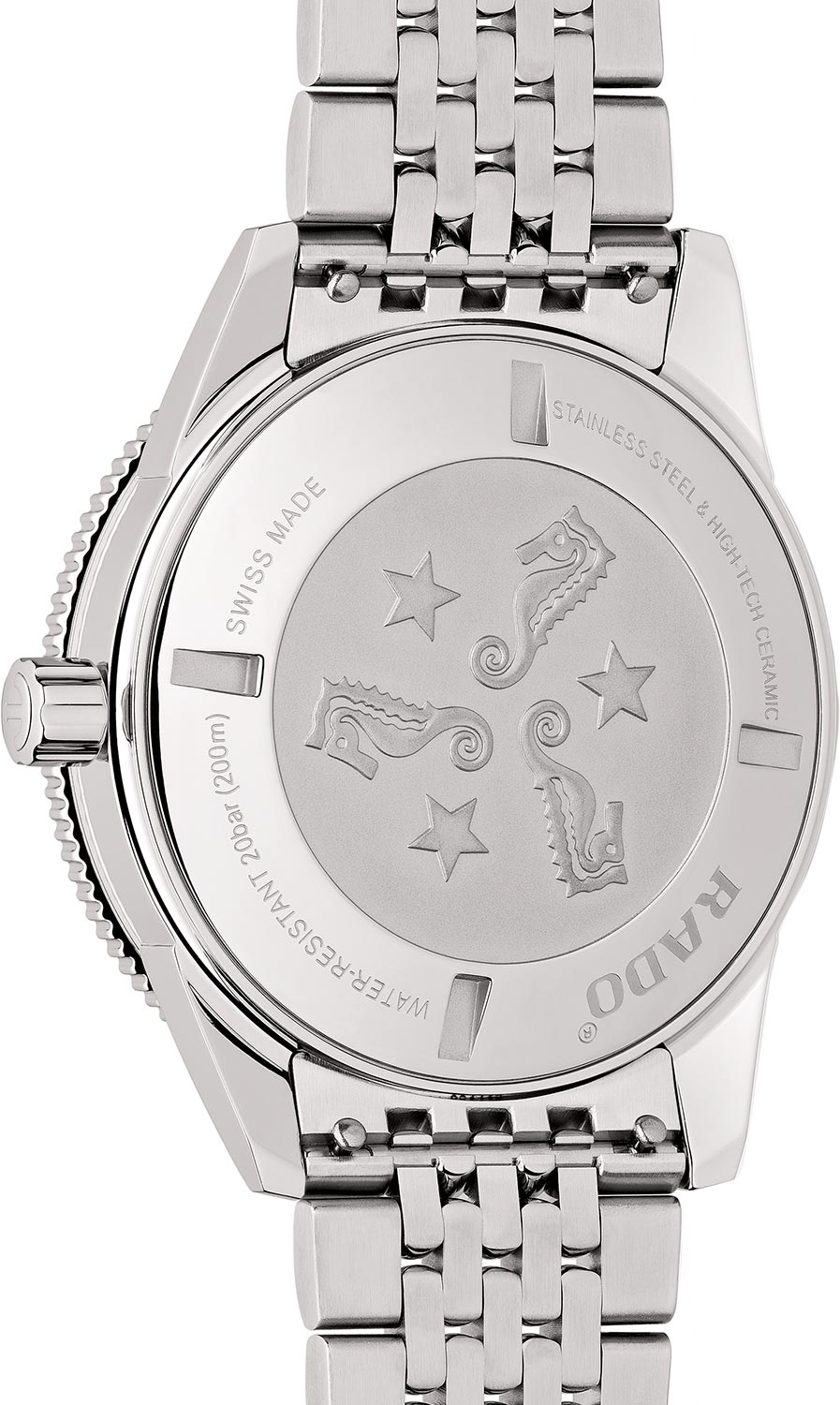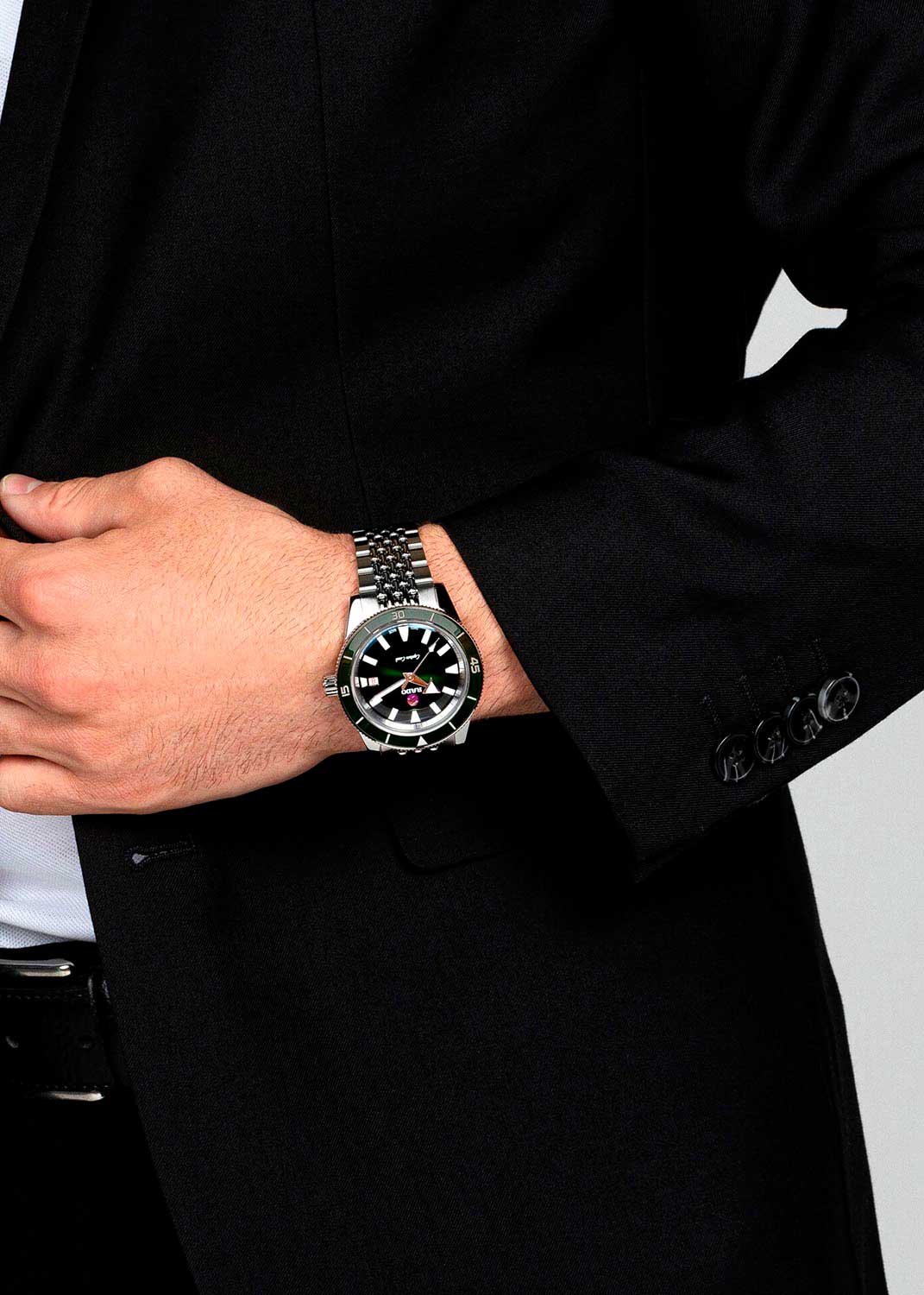 Метки в виде штрихов. Метки и стрелки с люминесцентным покрытием, которое светится в темноте после непродолжительной зарядки на свету. Окошко даты находится в положении 3 часа. Рифленая заводная головка. Завинчивающаяся задняя крышка с гравировкой. Надежный стальной браслет с раскладывающейся застежкой. Система быстрой замены браслета.