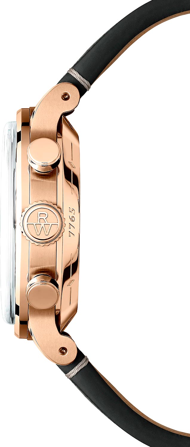 Прозрачная задняя крышка с сапфировым стеклом. Рифленая заводная головка с логотипом RW. Удобный кожаный ремешок с классической застежкой.