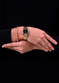 Прямоугольные стрелки в стиле Baton с люминесцентным покрытием, которое светится в темноте после непродолжительной зарядки на свету. Рифленая заводная головка. Надежный стальной браслет матовой и полированной отделки с раскладывающейся застежкой. В комплекте теннисный стальной браслет, украшенный кристаллами.
