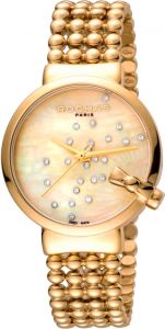 Женские кварцевые часы La Boucle evolution. Круглый стальной корпус с IP покрытием цвета желтого золота. Перламутровый циферблат без меток декорирован россыпью из 24-х кристаллов и логотипом бренда в положении 12 часов. Клиновидные стрелки в стиле Dauphine. Гладкая заводная головка расположена в нижней части корпуса и декорирована стальным бантиком. Оригинальный стальной браслет с IP покрытием цвета желтого золота и застежкой-бабочкой.