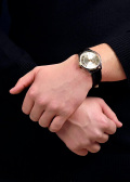 Стрелки с люминесцентным покрытием, которое светится в темноте после непродолжительной зарядки на свету. Окошко даты находится в положении 6 часов. Рифленая заводная головка. Удобный кожаный ремешок с классической застежкой.