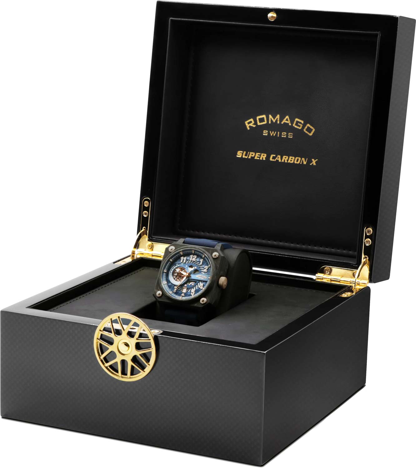 корпус этих часов от ROMAGO позволит чувствовать себя уверенно в любой обстановке.Super Carbon X. Лимитированная серия - 300 экземпляров. Дизайн часов вдохновлен гоночными автомобилями. Запас хода до 44 часов. Индикация секунд вынесена на отдельный циферблат. Карбоновый