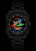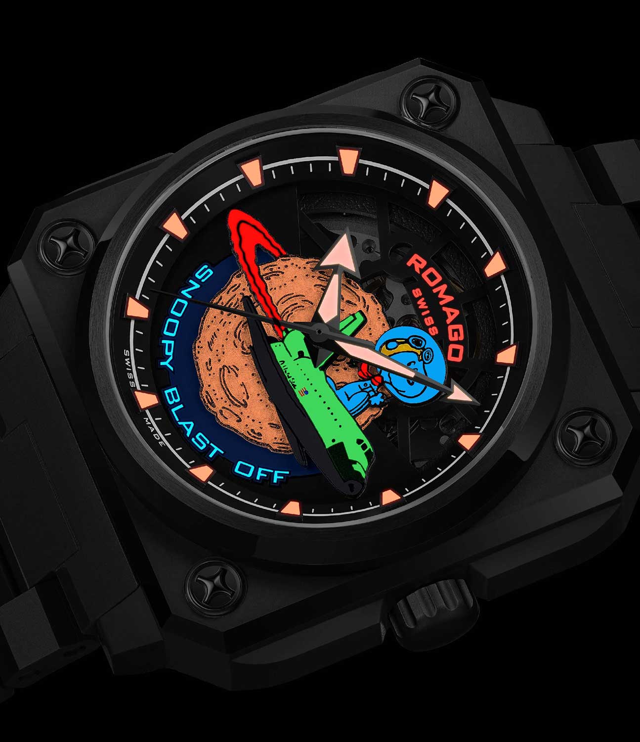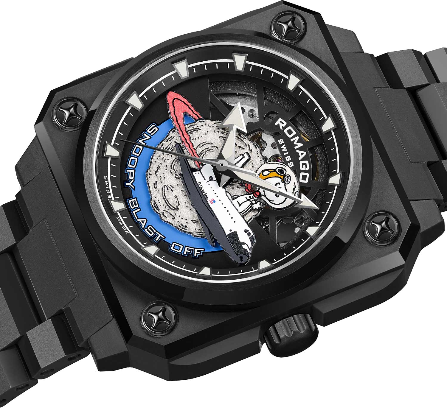 Циферблат с метками в виде штрихов защищен прочным сапфировым стеклом и украшен персонажем Snoopy на борту космического корабля, летящего на Луну. Заводная головка украшена буквой «R». Стальная задняя крышка крепится на 4-х винтах и украшена гравировкой. Керамический браслет с раскладывающейся застежкой.
