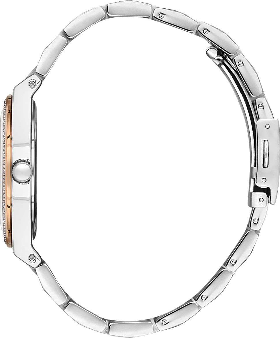 украшен паве из кристаллов. Циферблат выполнен по технологии Sunray (солнечные лучи). Клиновидные стрелки в стиле Dauphine с люминесцентным