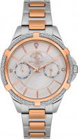 Женские наручные кварцевые часы. Круглый стальной корпус с дизайнерским безелем. Двухуровневый циферблат с вставкой из перламутра выполнен по технологии Sunray (солнечные лучи) и украшен фирменным логотипом. Накладные метки в виде штрихов и точек с кристаллами. Дата и день недели отображаются на отдельных циферблатах. Рифленая заводная головка с защитой. Стальной браслет с матовой и полированной отделкой. Раскладывающаяся застежка.