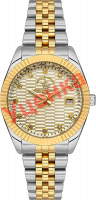 Женские наручные часы. Круглый корпус с рифленым безелем. Структурный циферблат с накладными метками в виде точек, украшенных кристаллами. Окошко даты находится в положении 3 часа. Стрелки с люминесцентным покрытием, которое светится в темноте после непродолжительной зарядки на свету. Рифленая заводная головка. Стальной браслет с раскладывающейся застежкой.
