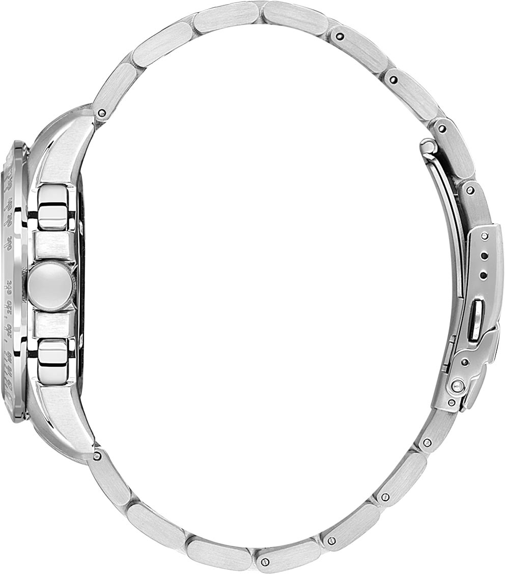 Окошко даты находится между отметками 4 и 5 часов. Стрелки и метки с люминесцентным покрытием, которое светится в темноте после непродолжительной зарядки на свету. Рифленая заводная головка с защитой. Стальной браслет с раскладывающейся застежкой.