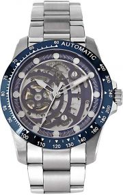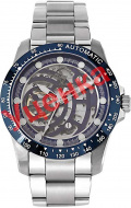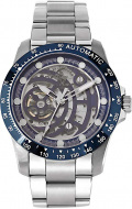 Наручные скелетонизированные часы. Круглый стальной корпус. Двухуровневый циферблат с накладными метками в виде точек украшен фирменным логотипом. Рифленая заводная головка с защитой. Прозрачная задняя крышка. Стальной браслет с раскладывающейся застежкой.