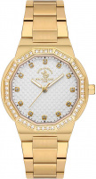 Кварцевые наручные женские часы. Круглый стальной корпус с 12-гранным безелем украшенным кристаллами. Фактурный циферблат украшен фирменным логотипом. Накладные метки в виде точек, украшенных кристаллами. Скругленные прямоугольные стрелки в стиле Baton с люминесцентным покрытием, которое светится в темноте после непродолжительной зарядки на свету. Заводная головка в форме болта. Стальной браслет с раскладывающейся застежкой.