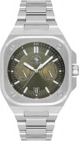 Функциональные мужские наручные часы. Квадратный стальной корпус с матовой и полированной отделкой. Декоративный безель на 4-х болтах. Циферблат выполнен по технологии Sunray (солнечные лучи) и украшен фирменным логотипом. Накладные метки в виде штрихов. 12-ти и 24-х часовой формат времени. День недели вынесен на отдельный циферблат. Окошко даты находится в положении 6 часов. Скругленные прямоугольные стрелки в стиле Baton. Стрелки и метки с люминесцентным покрытием, которое светится в темноте после непродолжительной зарядки на свету. Заводная головка с защитой, выполнена в форме болта. Надежный стальной браслет с матовой и полированной отделкой. Раскладывающаяся застежка.