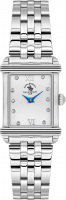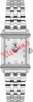 Наручные женские часы в прямоугольном стальном корпусе. Сатинированный циферблат украшен фирменным логотипом. Накладные метки в виде римских цифр и точек, украшенных кристаллами. Синие клиновидные стрелки в стиле Dauphine. Рифленая заводная головка. Стальной браслет с полированной отделкой. Раскладывающаяся застежка.