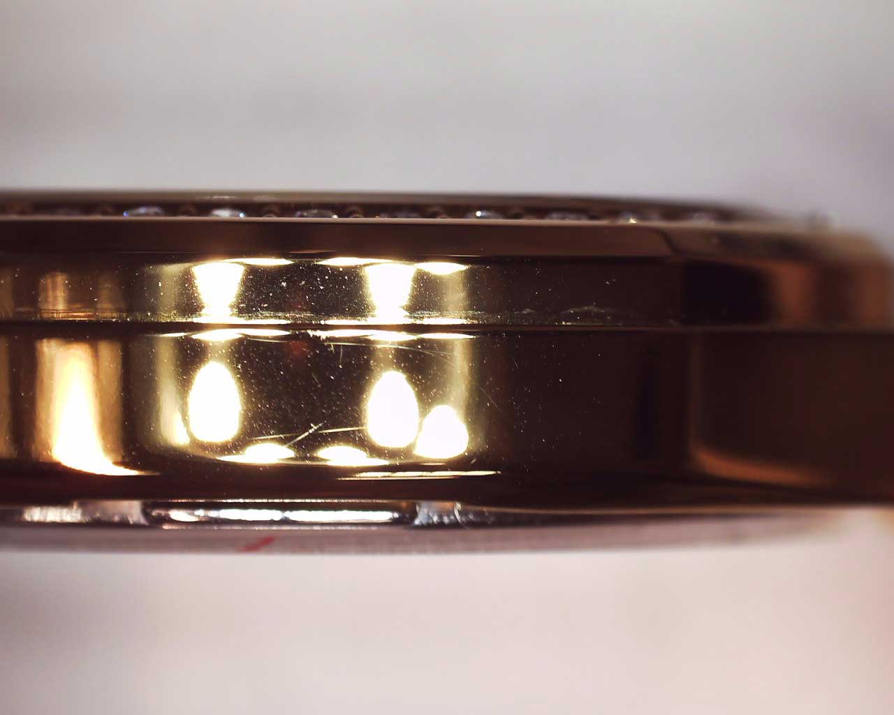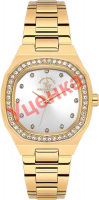 Наручные женские часы в стальном корпусе. Восьмигранный безель украшен паве из сверкающих кристаллов. Циферблат выполнен по технологии Sunray (солнечные лучи) и украшен фирменным логотипом. Накладные метки в виде точек, украшенных кристаллами. Клиновидные стрелки в стиле Dauphine. Гладкая заводная головка. Стальной браслет с полированной отделкой. Раскладывающаяся застежка.