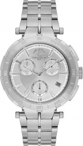 Функциональные мужские часы-хронограф с секундомером. Стальной корпус с матовой отделкой. Двухуровневый матовый циферблат украшен фирменным логотипом. Накладные метки в виде штрихов. 12-ти и 24-х часовой формат времени. Окошко даты находится в положении 4 часа.