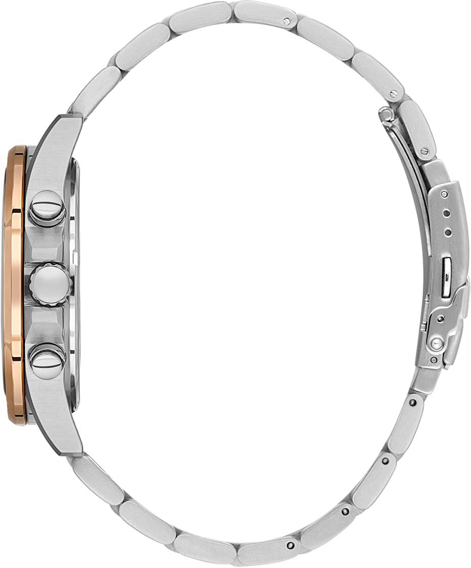 Время в 24-х часовом формате, второй часовой пояс и день недели отображаются на отдельных циферблатах. Стрелки и метки с люминесцентным покрытием, которое светится в темноте после непродолжительной зарядки на свету. Рифленая заводная головка с защитой. Стальной браслет с раскладывающейся застежкой.