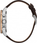 Время в 24-х часовом формате, второй часовой пояс и день недели отображаются на отдельных циферблатах. Стрелки и метки с люминесцентным покрытием, которое светится в темноте после непродолжительной зарядки на свету. Рифленая заводная головка с защитой. Удобный кожаный ремешок с классической застежкой.