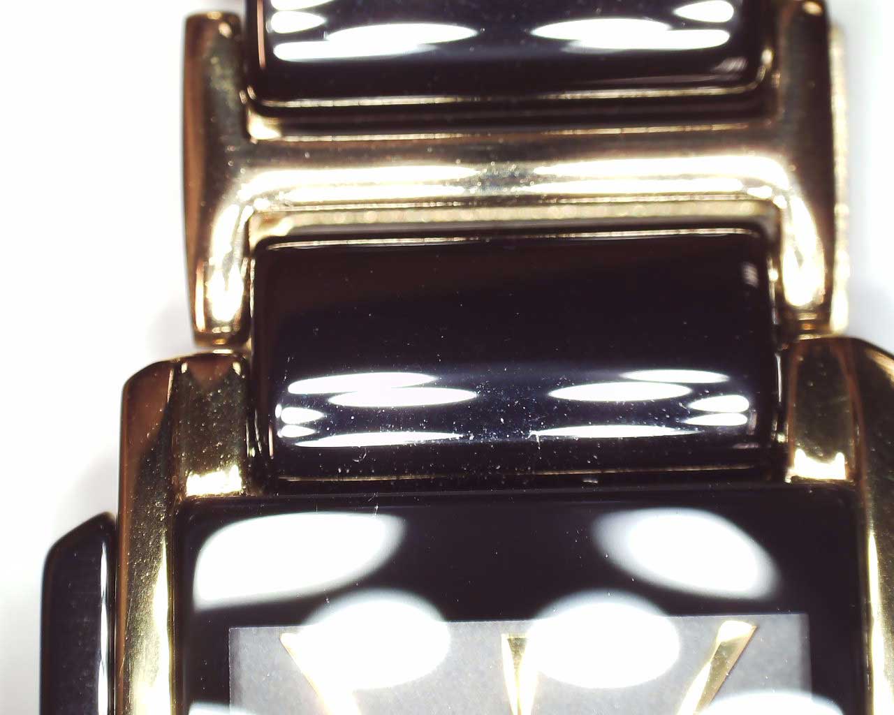 Pair. Женские часы. Прямоугольный керамический корпус. Матовый циферблат украшен фирменным логотипом. Накладные метки в виде штрихов. Острые стрелки в стиле Alpha. Стальной браслет с керамическими вставками. Рифленая заводная головка. Раскладывающаяся застежка.
