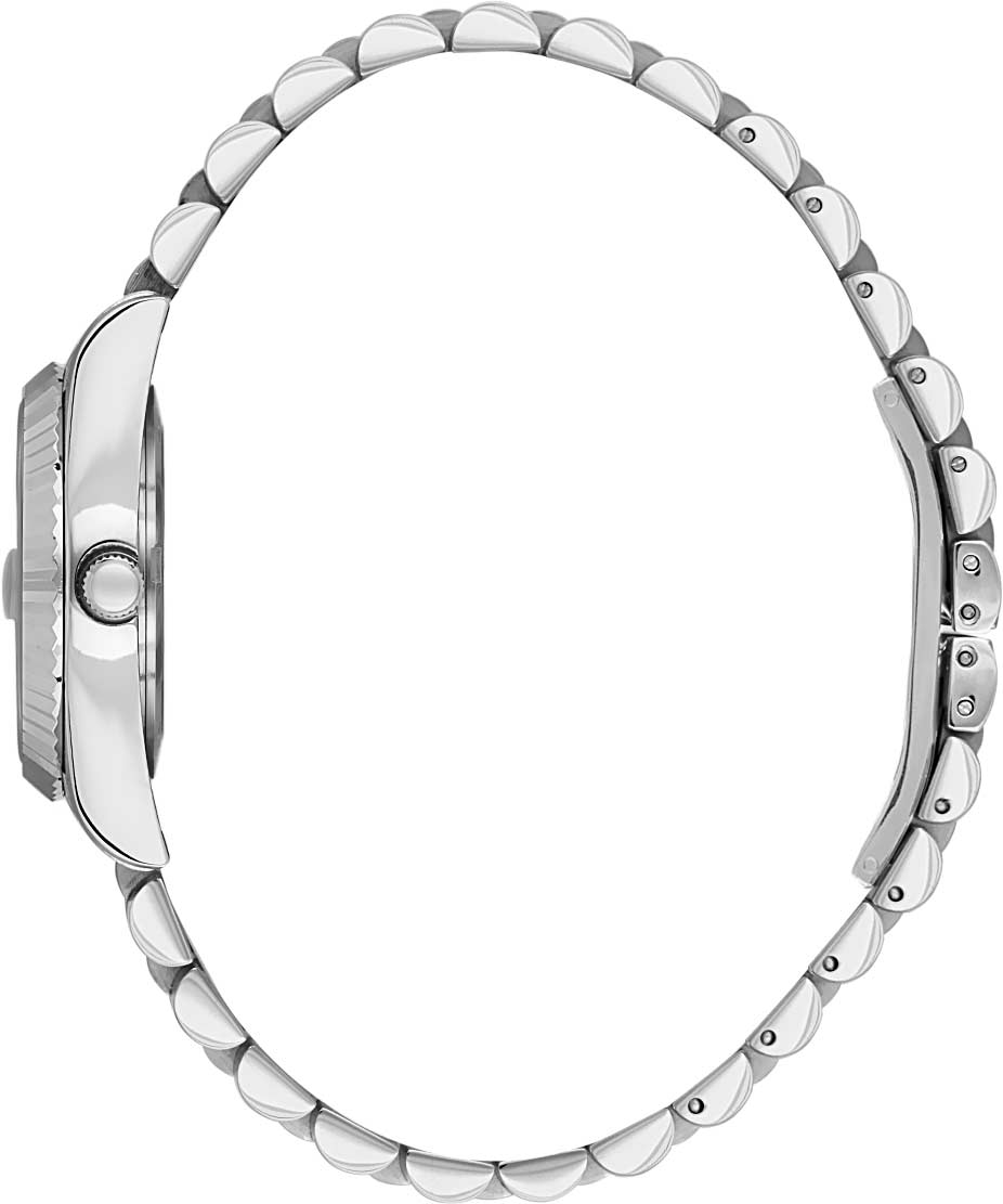 Стрелки с люминесцентным покрытием, которое светится в темноте после непродолжительной зарядки на свету. Рифленая заводная головка. Стальной браслет с раскладывающейся застежкой.