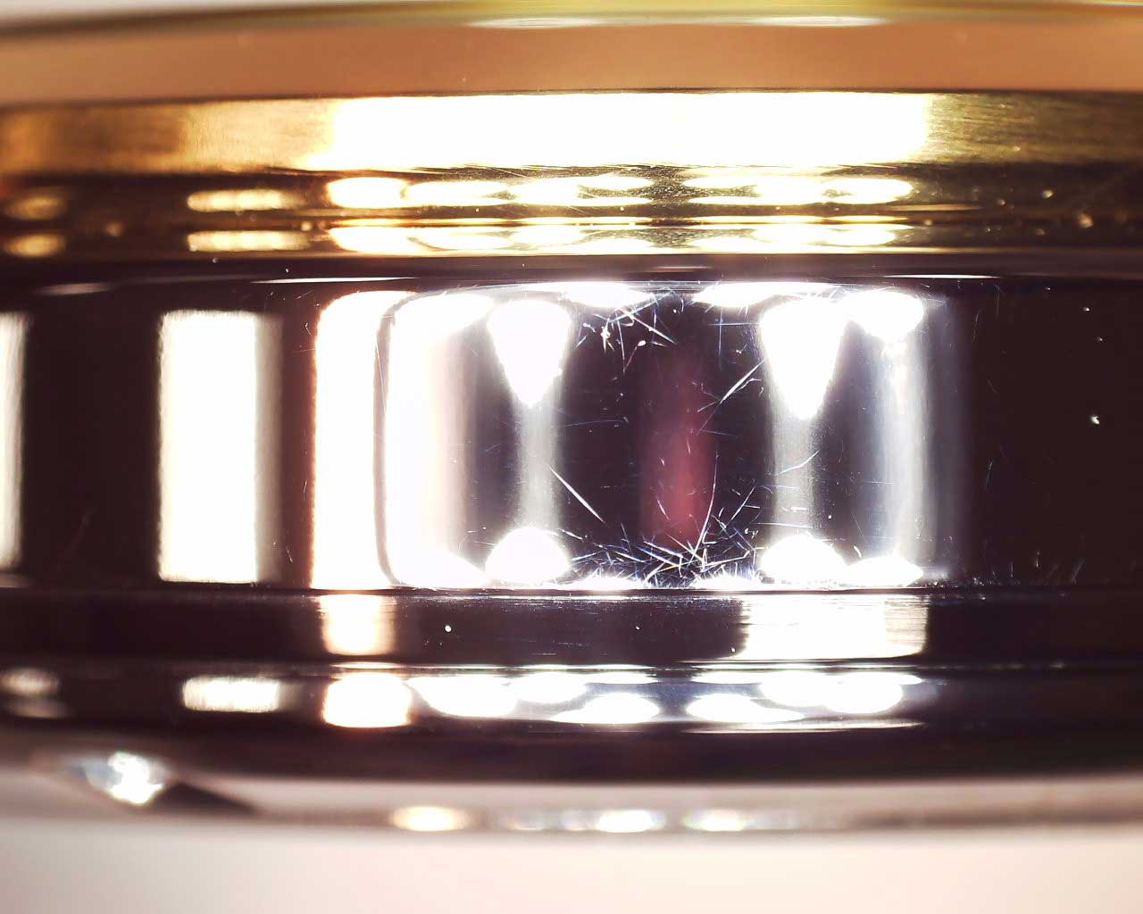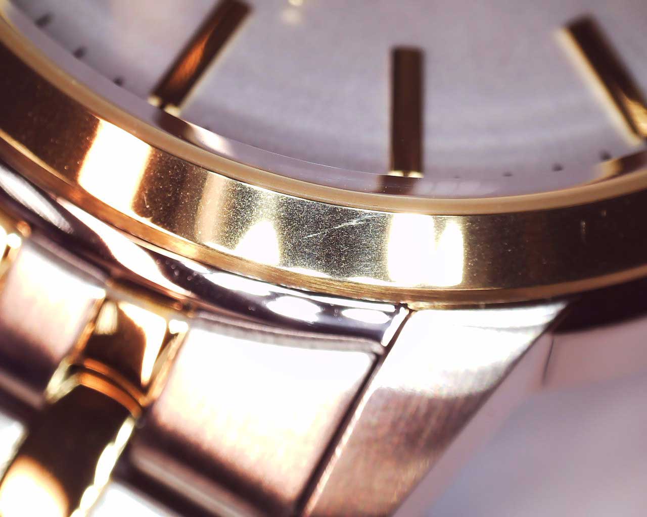 Циферблат с метками в виде штрихов выполнен по технологии Sunray (солнечные лучи). Окошко даты находится в положении 3 часа. Завинчивающаяся прозрачная задняя крышка. Браслет с тройной раскладывающейся застежкой.