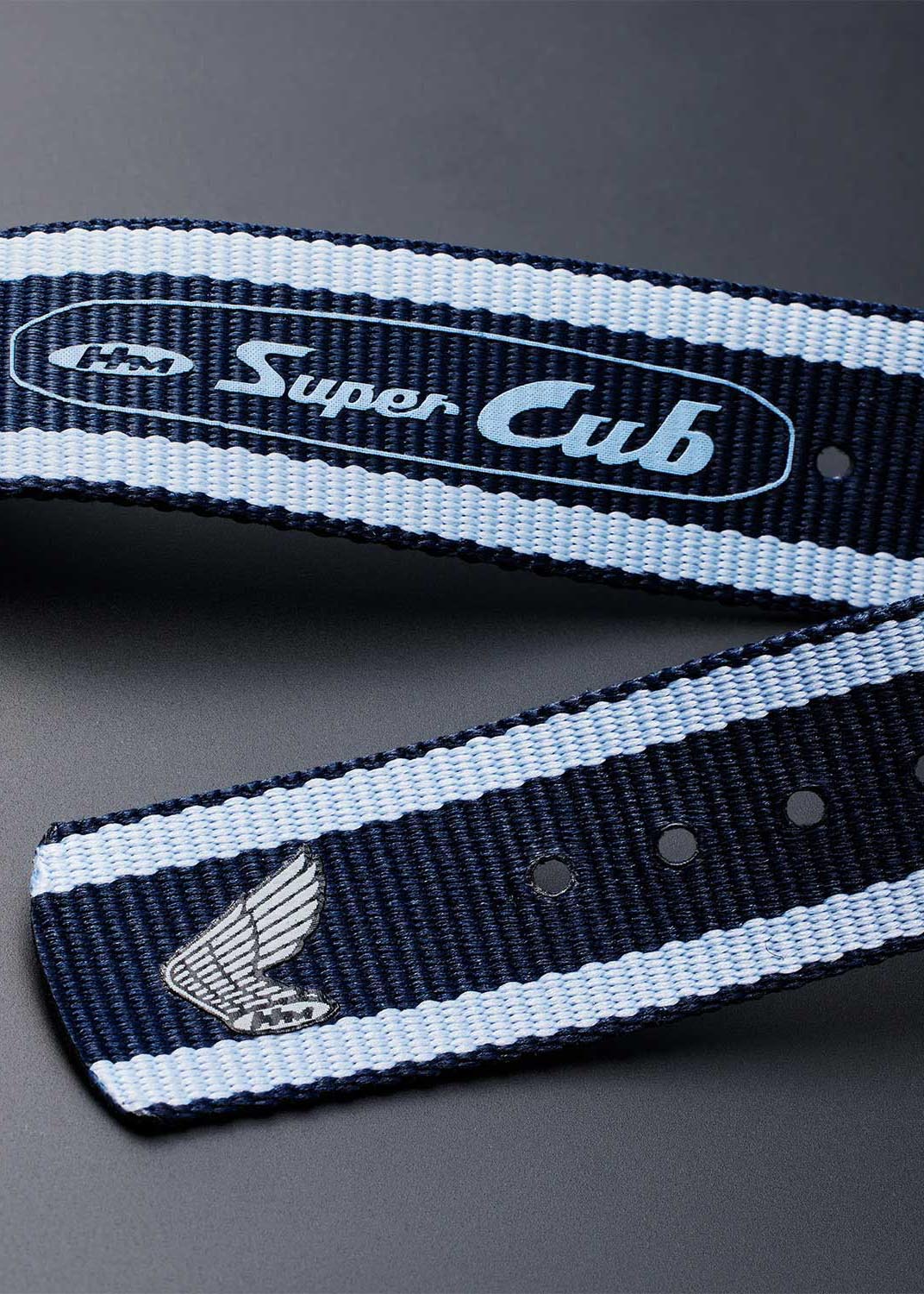 Заводная головка с защитой в положении 4 часа. Завинчивающаяся задняя крышка украшена логотипом Honda Super Cub и выгравированным серийным номером. Ремешок с классической застежкой.