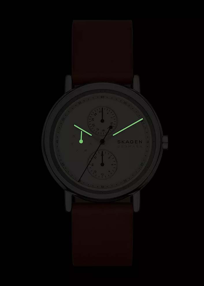Стрелки с люминесцентным покрытием, которое светится в темноте после непродолжительной зарядки на свету. Гладкая заводная головка. Удобный кожаный ремешок с классической застежкой.