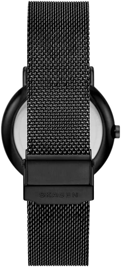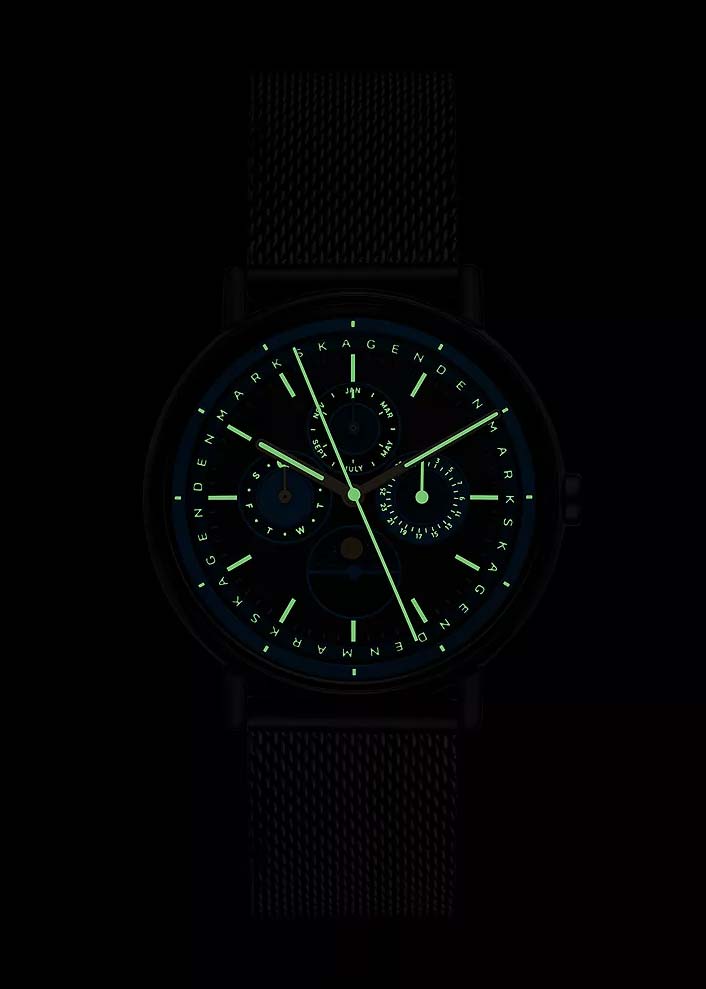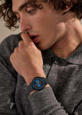 Стрелки и метки с люминесцентным покрытием, которое светится в темноте после непродолжительной зарядки на свету. Гладкая заводная головка. Стальной браслет миланского плетения с раскладывающейся застежкой.