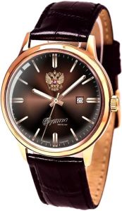 стеклом. На циферблате изображение герба Российской Федерации и автографа В.В. Путина. Циферблат выполнен по технологии Sunray (солнечные лучи). Заостренные прямоугольные стрелки в стиле Baton с люминесцентным