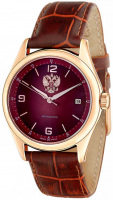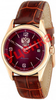 Классические мужские механические часы Премьер. Круглый полированный корпус. Циферблат украшен изображением герба РФ. Окошко даты в положении 3 часа. Метки в виде штрихов и арабских цифр. В механизме 21 камень, частота 21600 полуколебаний в час. Запас хода 42 часов. Рифленая заводная головка. Удобный кожаный ремешок с классической застежкой.