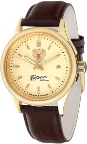 стеклом. На циферблате изображение герба Российской Федерации и автографа В.В. Путина. Заостренные прямоугольные стрелки в стиле Baton. Метки в виде штрихов. Метки и стрелки с люминесцентным